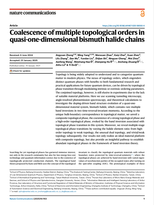 近日,物理学院表面物理与量子物质研究团队与清华大学、南开大学等合作,在实现多重可控拓扑相变研究方面取得重要进展,相关研究成果于1月30日以“Coalescence of multiple topological orders in quasi-one-dimensional bismuth halide chains”为题在线发表于《Nature Communications》上。其中,物理学院博士生钟景元、分析测试中心物理性能表征平台教师杨明为共同第一作者。
