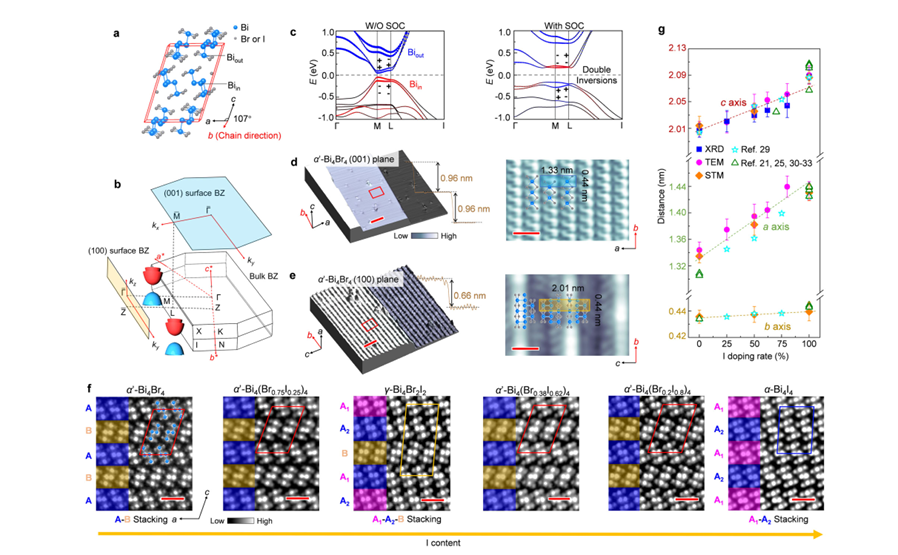 在此项工作中,研究团队利用角分辨光电子能谱、扫描隧道显微镜以及理论计算,研究了一种准一维材料体系——Bi4X4(X=Br,I),通过调控卤族元素Br和I的比例实现多重可控拓扑相变,进一步实现了双重拓扑序共存的拓扑量子材料。在该材料体系中,Bi元素提供强自旋轨道耦合作用,导致其电子结构具有双点双重能带反转(图a-b),产生高阶拓扑量子相。以此为基础,通过Br和I元素掺杂能够实现单点的能带交叉(图c),导致高阶拓扑和强拓扑的复合拓扑态诞生于Br:I摩尔比约2:8的Bi4X4晶体中。