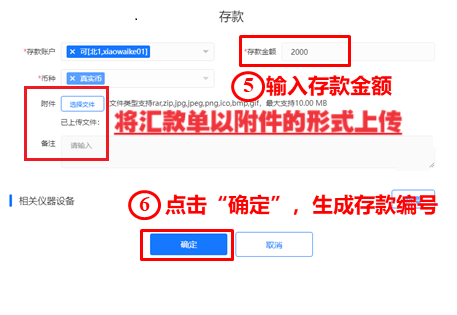三、输入存款金额,将汇款单以附件的形式上传,点击“确定”,生成存款编号(此编号为唯一核对信息,在对公汇款时请务必填写)。