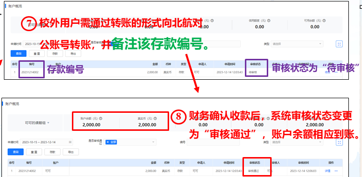 五、分析测试中心财务老师在学校对公账户中查询到此笔汇款后,在预约系统中进行存款确认,“审核通过”后,账户余额相应到账,存款完成,校外用户可以填写申请单,申请预约测试。