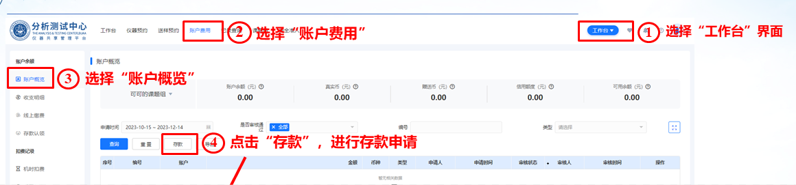 二、校外用户登录仪器预约系统,选择“工作台”界面,选择“账户费用”,选择“账户概览”,点击“存款”,提交存款申请。