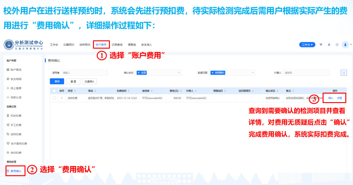 七、测试完成后,校外用户及时登录预约系统进行测试费用确认,若有异议,请及时与测试老师沟通,复核测试费用。若无异议,则点击“确认”完成费用确认,同时系统完成实际扣费。